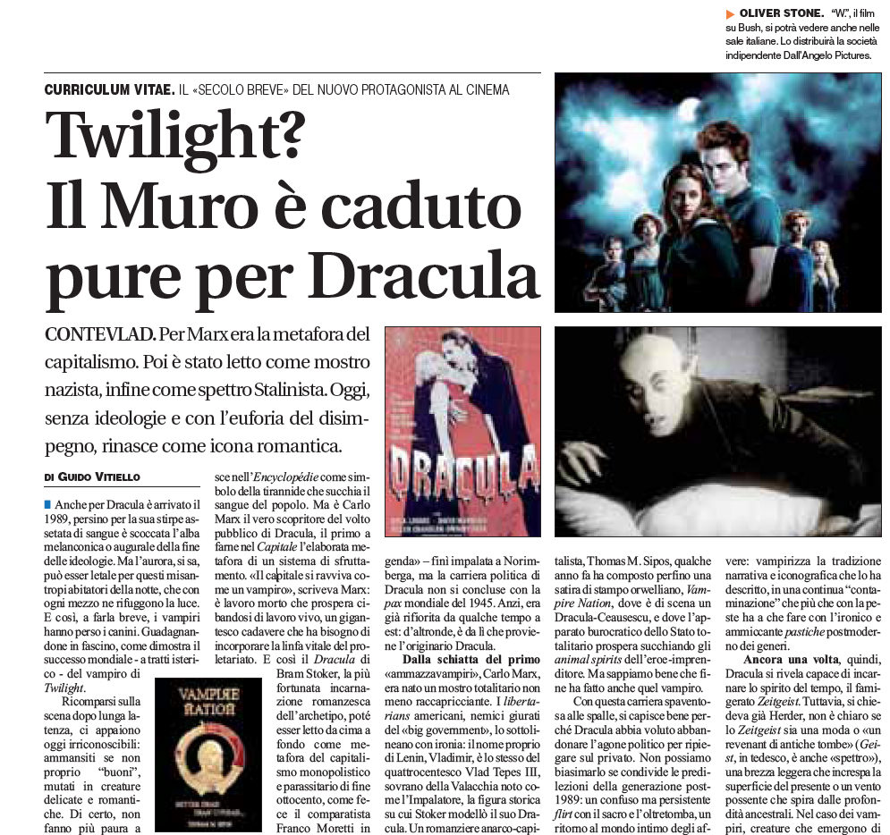 Dalla schiatta del primo «ammazzavampiri», Carlo Marx, era nato un mostro totalitario non meno raccapricciante. I libertarians americani, nemici giurati del «big government», lo sottolineano con ironia: il nome proprio di Lenin, Vladimir, è lo stesso del quattrocentesco Vlad Tepes III, sovrano della Valacchia noto come l’Impalatore, la figura storica su cui Stoker modellò il suo Dracula. Un romanziere anarco-capitalista, Thomas M. Sipos, qualche anno fa ha composto perfino una satira di stampo orwelliano, Vampire Nation, dove è di scena un Dracula-Ceausescu, e dove l’apparato burocratico dello Stato totalitario prospera succhiando gli animal spirits dell’eroe-imprenditore. Ma sappiamo bene che fine ha fatto anche quel vampiro. Con questa carriera spaventosa alle spalle, si capisce bene perché Dracula abbia voluto abbandonare l’agone politico per ripiegare sul privato. Non possiamo biasimarlo se condivide le predilezioni della generazione post-1989: un confuso ma persistente flirt con il sacro e l’oltretomba, un ritorno al mondo intimo degli affetti e delle passioni. Parassita lo è ancora, ma sul suo stesso cadavere: vampirizza la tradizione narrativa e iconografica che lo ha descritto, in una continua “contaminazione” che più che con la peste ha a che fare con l’ironico e ammiccante pastiche postmoderno dei generi.