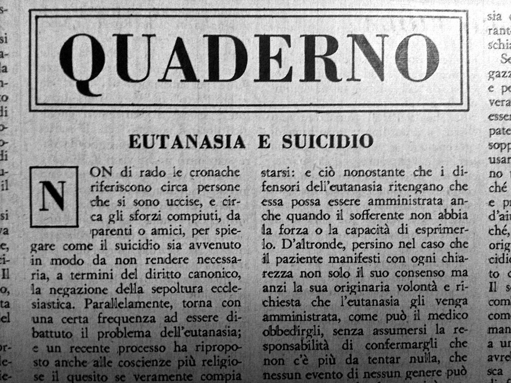 Non di rado le cronache riferiscono circa persone che si sono uccise, e circa gli sforzi compiuti, da parenti o amici, per spiegare come il suicidio sia avvenuto in modo da non rendere necessaria, a termini del diritto canonico, la negazione della sepoltura ecclesiastica. Parallelamente, torna con una certa frequenza ad essere dibattuto il problema dell’eutanasia; e un recente processo ha riproposto anche alle coscienze più religiose il quesito se veramente compie delitto chi, col più sincero intento di aiuto per una persona irrimediabilmente condannata a morire dopo atroci sofferenze, la libera da esse, affrettando la sua fine.
