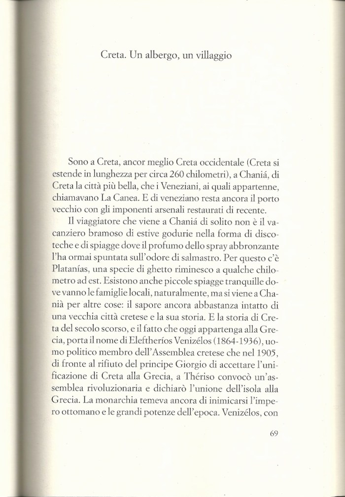 2) Dépliant turistico. “Il sapore ancora abbastanza intatto di una vecchia città cretese e la sua storia”. Ditemi voi se uno scrittore, non un copywriter della Valtur, può uscirsene con una frase come questa. Il sapore intatto della storia? Questo gergo dell’autenticità è lo stesso su cui prospera il marketing alimentare dei prodotti tipici, e su cui vivacchia la generazione di autori locali-dialettali più falsa e furbetta della nostra storia letteraria. I due registri, l’enciclopedico e il turistico, suonano ancora più stonati se vi si frammischia il terzo: