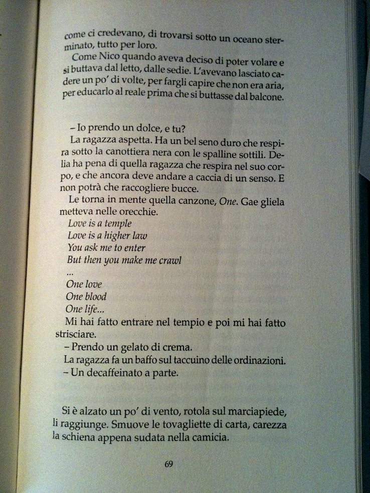 A innamorarsi [Gaetano] non ci pensa. L’amore è morto. La costruzione dell’amore, partendo dalla saliva per arrivare all’impossibile. Sono caduti dalla roccia più alta lui e Delia, e sotto l’acqua era poca. Si guardano e non sanno se resteranno immobilizzati a vita, in sedia a rotelle spinti da qualche buon cuore, o soltanto claudicanti. Certo è stato un bel salto. Cazzo come ci credevano…