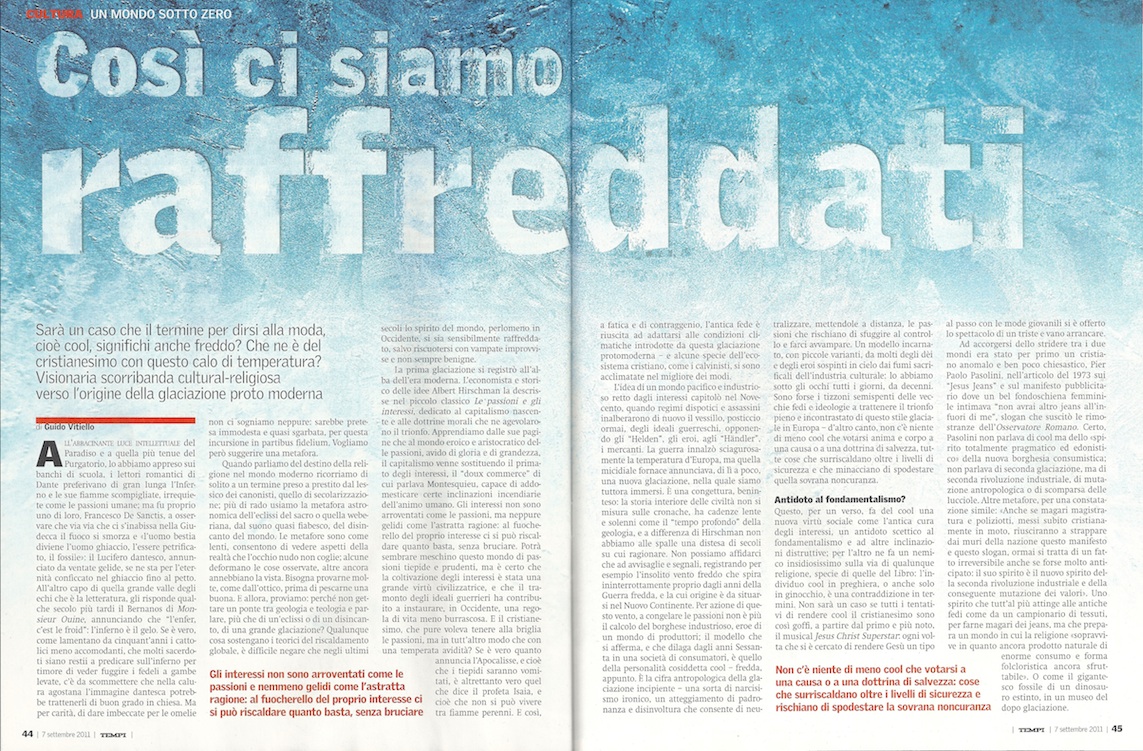 Il settimanale cattolico Tempi mi ha chiesto, lo scorso luglio, di espandere una frase del mio articolo sul cool, Il dolce stil fico, fino a farne un articolo. La frase era questa: “E se avessero occhi per vedere, gli uomini di chiesa capirebbero che la minaccia non viene da una dottrina, il relativismo, ma da uno stile emotivo che prende a modello proprio i ‘tiepidi’ contro cui tuona l’Apocalisse. Non di secolarizzazione dovrebbero parlare, per queste decadi, ma di un principio di glaciazione”. Far lievitare una metafora buttata lì senza troppo pensare non sempre è facile, ad ogni modo questo è il meglio che sono riuscito a inventarmi.