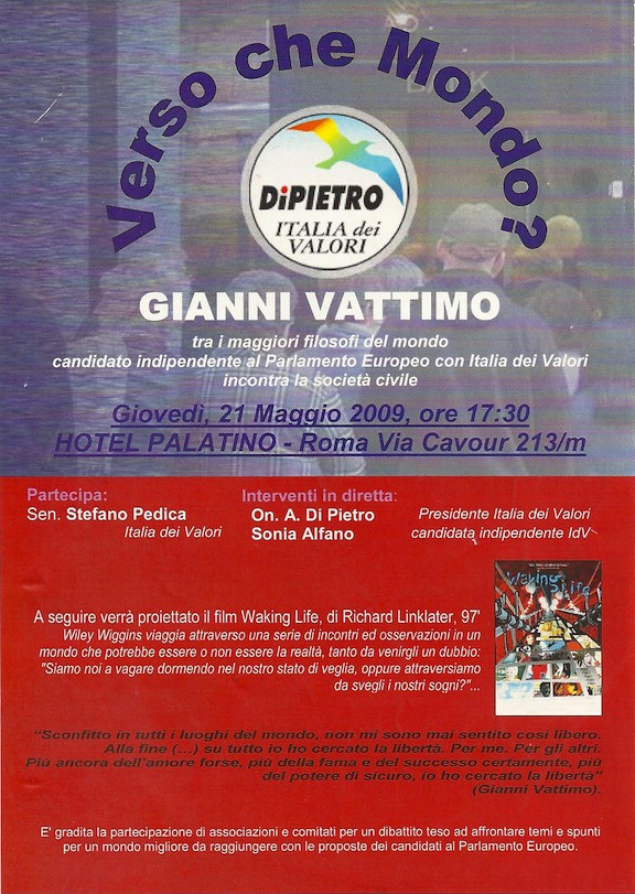 Nella primavera di qualche anno fa gli abitanti della capitale trovarono nella cassetta della posta un sublime volantino dipietrista: il 21 maggio 2009, ore 17:30, Gianni Vattimo, candidato indipendente al Parlamento europeo con l’Italia dei Valori, incontra la società civile all’Hotel Palatino di via Cavour. Partecipa il Sen. Stefano Pedica, intervengono in diretta l’On. A. Di Pietro e Sonia Alfano. “È gradita la partecipazione di associazioni e comitati per un dibattito teso ad affrontare temi e spunti per un mondo migliore”. A seguire, proiezione di un film di fantascienza, forse di fantascienza debole, già che il protagonista attraversa “un mondo che potrebbe essere o non essere la realtà”. La citazione di Vattimo scelta per l’occasione confermava l’appartenenza del filosofo alla stirpe dei supereroi, sottospecie oltreuomini nietzschiani: “Sconfitto in tutti i luoghi del mondo, non mi sono mai sentito così libero. Su tutto io ho cercato la libertà. Per me. Per gli altri”. E da grandi poteri, lo sappiamo da Spiderman, derivano grandi responsabilità. Sul volantino, con deferente scappellata contadina, Vattimo era presentato come uno “tra i maggiori filosofi del mondo”. L’incontro, coerentemente, s’intitolava: “Verso che mondo?”.
