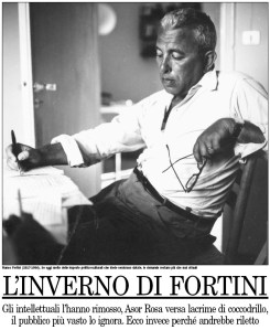 Ora Asor parla di “vigliaccata”, ma non dà al “compagno di strada” l’unico risarcimento dovuto: e cioè una rilettura adeguata della sua opera. Anche perché una tale rilettura sarebbe un suicidio per lui, dato che le migliori pagine di Fortini sono un’inesausta denuncia dei privilegi acquisiti proprio dal ceto intellettuale di cui Asor fa parte. Comunque, leggendo la “prefazione storica”, ho pensato che quello asorrosiano non solo non è un risarcimento, ma sembra anzi una nuova pernacchia a Fortini. Non è un’impudenza, da parte sua, pubblicare l’antologia di un decennio, quasi a riecheggiare il titolo del libro più bello di Fortini, Dieci inverni, che è anche il testo fortiniano meno capito dai nostri critici marxologhi? Davanti a questo pensiero ho chiuso Le armi della critica, sono uscito dalla libreria, e mi sono detto che in un’Italia in cui è ormai praticamente un autore inedito, è ora di risarcire Fortini con un vero ritratto, e soprattutto di contrapporre al decennio di formazione asorrosiana quello di formazione fortiniana. Ma per farlo, intanto, bisogna chiedersi: a poco meno di vent’anni dalla morte, chi legge Franco Fortini, e come? Direi che tra gli intellettuali prevalgono due forme di rimozione, che si riflettono nella quasi totale ignoranza del pubblico più vasto. O si considera Fortini un vecchio codice che non vale la pena decifrare: e così si confermano le critiche che lui rivolse ai suoi contemporanei, già inclini alla semplificazione e al culto delle personalità mediatiche (si vedano le pagine dedicate al suo fratello-avversario, il sempre stracitato Pasolini); oppure, viceversa, lo si venera tradendone l’autonomia intellettuale: e si sbandiera, come Asor Rosa e molti altri, un marxismo ridotto a petizione di principio, mentre si lascia cadere proprio la sua eredità più viva, cioè la continua “verifica dei poteri” nel campo della cultura. Ma così, i “fortiniani” trattano Fortini appunto come fosse Asor o Toni Negri, riducendolo al suo più effimero timbro apocalittico o settario; e quando poi si occupano di letteratura contemporanea finiscono per esaltare proprio quei prodotti demagogici inquinati dall’engagement dozzinale già censurato da Fortini nel Metello pratoliniano: e li esaltano, s’intende, solo perché sono contrabbandati come “antagonisti”, o perché parlano della Realtà stereotipata dell’attualità giornalistica. Invece occorre ribaltare la prospettiva.